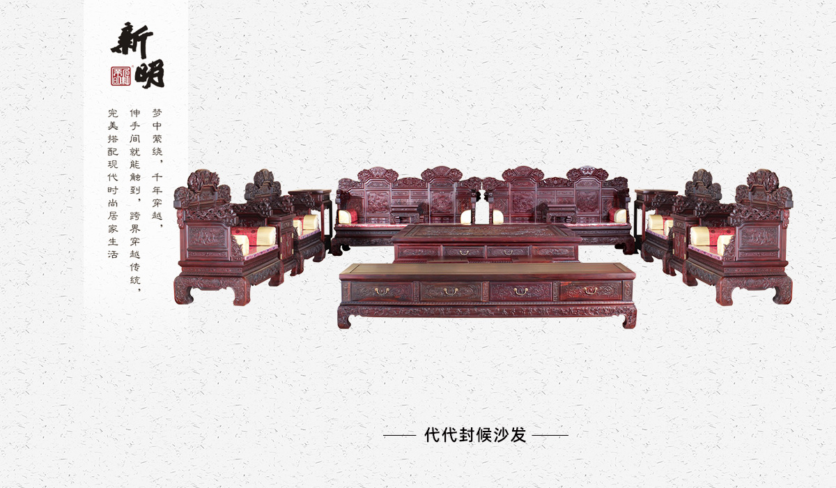 東陽市新明紅木家具有限公司由創始人中國傳統工藝大師張新民先生在1995年2月創建于擁有“百工之鄉”、“木雕之鄉”的浙江省東陽市橫店鎮,是一家集研發、設計、生產、銷售于一體的國內大型專業生產紅木家具的綜合型企業。經過30年的持續發展,到今天已經成為目前國內紅木行業規模很大的企業之一。公司占地面積70畝,擁有生產車間面積12萬多平方米,展館面積1.5萬多平方米,行政、辦公、會議、倉儲面積2.8萬多平方米。公司目前設有6個藝術展館;①號為大紅酸枝博覽館,②十里紅妝古典藝術館,③墨語新美學家居館,④號為中式全屋整裝館,⑤號為新中式家居館,⑥號新品發布館。3000余平方的國際會議中心,將可同時容納全國二百家多家專賣店學習、培訓、會議。員工總人數達500余名,產值3.8億。